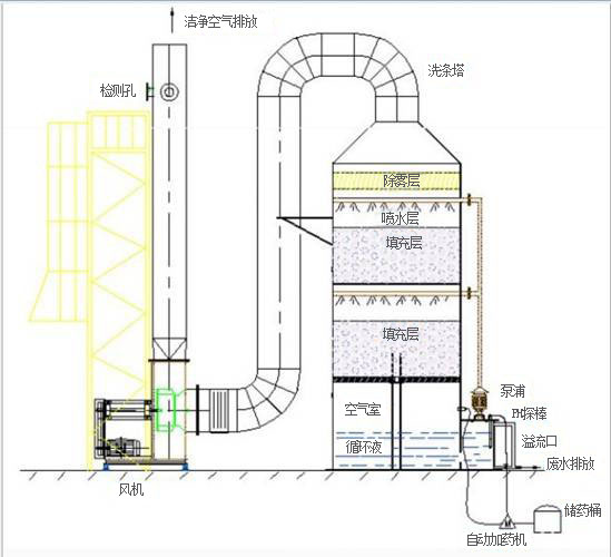 由于化學(xué)吸收液從塔頂往下噴淋,廢氣向上流,臭氣與吸收液充分接觸、反應(yīng)而被去除。吸收液與廢氣流量比例(液/氣比)一般為1-3 L/m 3 ,填料高度一般為2-5米,氣體空塔流速一般為0.5-1米/秒。操作良